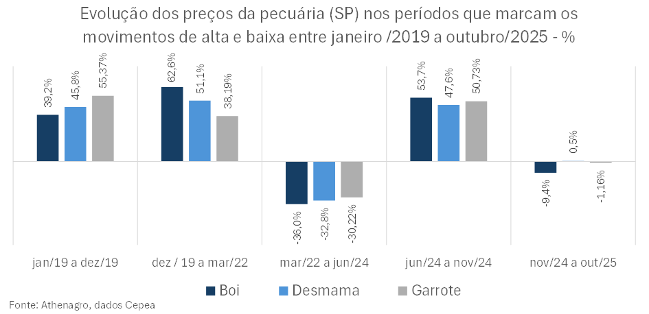 A alta registrada no período foi suficiente para estimular o mercado e promover grandes avanços no sistema de cria de bezerros, seja nas fazendas especializadas ou nas fazendas de ciclo completo. A oferta de animais aumentou significativamente, fazendo com que o mercado registrasse o maior período de baixa nos preços nominais, desde que o Real foi consolidado a partir de meados dos anos 1990.