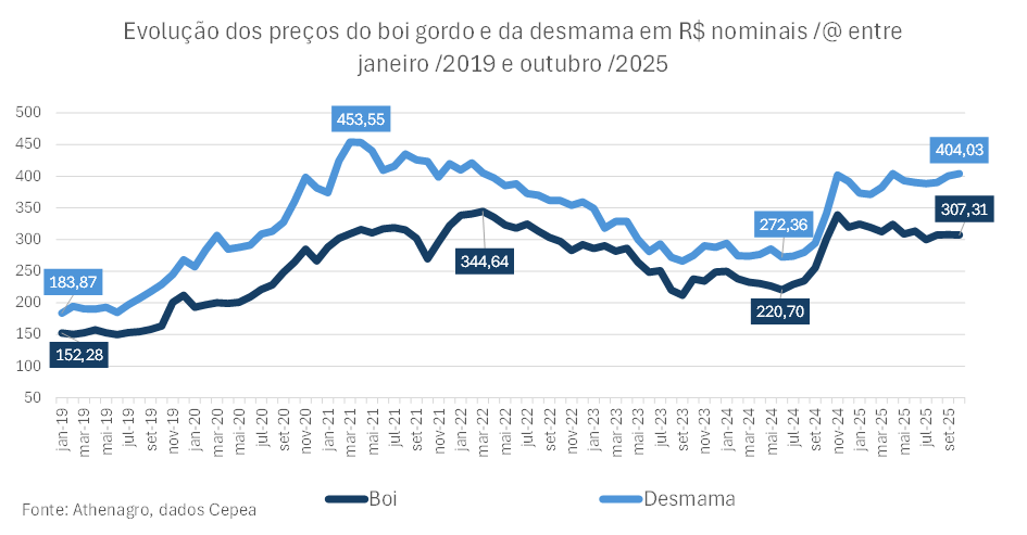 Evolução das cotações nominais da arroba do boi gordo e machos desmamados entre janeiro de 2019 e outubro de 2025.