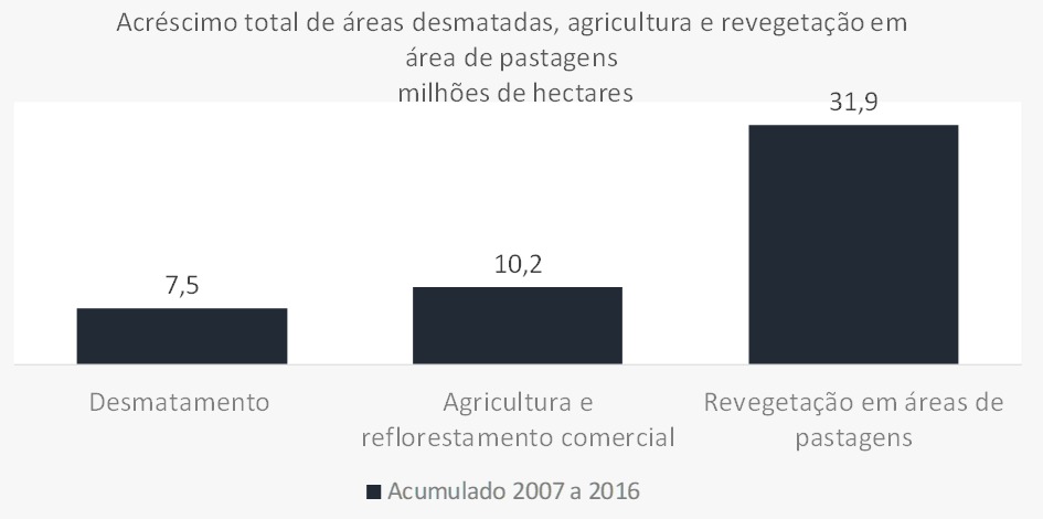 Nos últimos 10 anos, entre 2007 e 2016, a área total desmatada na Amazônia Legal foi de 7,5 milhões de hectares. No mesmo período, a agricultura avançou 10,2 milhões de hectares, enquanto a área de pastagens recuou 19 milhões de hectares. A soma da área destinada à produção agropecuária recuou de 250,1 para 241,4 milhões de hectares, um saldo de 8,8 milhões de hectares que deixaram de ser explorados pela agropecuária.